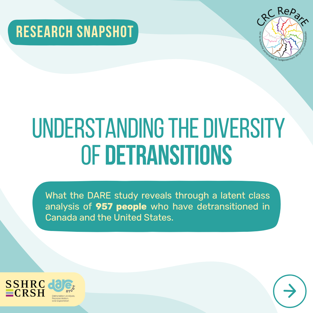 As the successor to the Canada Research Chair on Transgender Children and Their Families (CRC-ETF), the CRC-ReParE aims to produce empirical, intersectional and bilingual knowledge on the logics of exclusion and social inclusion of vulnerable young people. It also aims to elaborate the ethical dimensions of partnership research, and to develop methodologies to facilitate research aimed at empowerment and the confrontation of social inequalities.