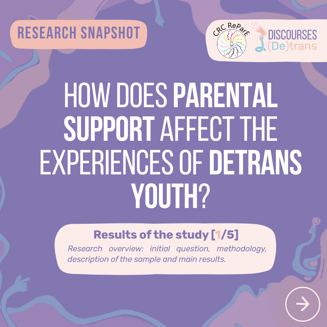 Over the past decade, we've heard more and more about young people who self-identify as trans (whose gender does not correspond to the one assigned at birth). In order to live in accordance with their gender identity, some young people make a legal, social or medical transition. While most young people seem to be continuing with these transitions, a small proportion say they have or want to "de-transition" or discontinue the transitions they have begun. This phenomenon, although poorly documented in scientific research, is widely reported in social media, blogs and press articles. Rooted in a fluid and intersectional trans-affirmative approach, the study offers a fresh look at the notion of detransition, taking into account the dynamic and fluid aspect of the gender affirmation process, as well as the multiple factors of oppression that can interweave and interact with the experience of young trans people.